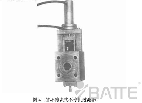 新型熔體換網(wǎng)過濾器在國內(nèi)的開發(fā)應(yīng)用較晚,上世紀(jì)八十年代年國內(nèi)一些企業(yè)才研制出帶料壓傳感報警系統(tǒng)和高壓污料泄荷系統(tǒng)的循環(huán)濾塊式不停機(jī)換網(wǎng)過濾器(圖4),該機(jī)可在佳時機(jī)報警更換濾網(wǎng),使換網(wǎng)時機(jī)選擇可準(zhǔn)確量化,防止錯換和漏換而且還能使主體總壓力比同類產(chǎn)品降低30%-50%,在美、德、日、奧、韓等國進(jìn)口的BOPP,CPE,EPE,塑料拉絲,彩印復(fù)膜生產(chǎn)線上配套使用證明安裝簡便,易操作,性能穩(wěn)定可靠。